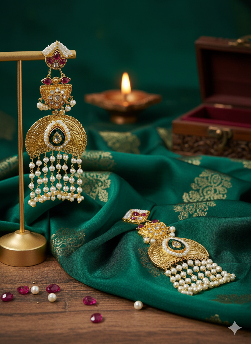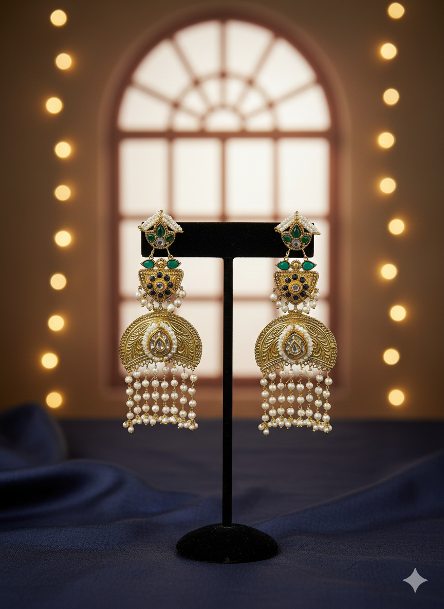 Traditional Gold-Plated Kashmiri Jhumka Earrings with Long Chains & Stone