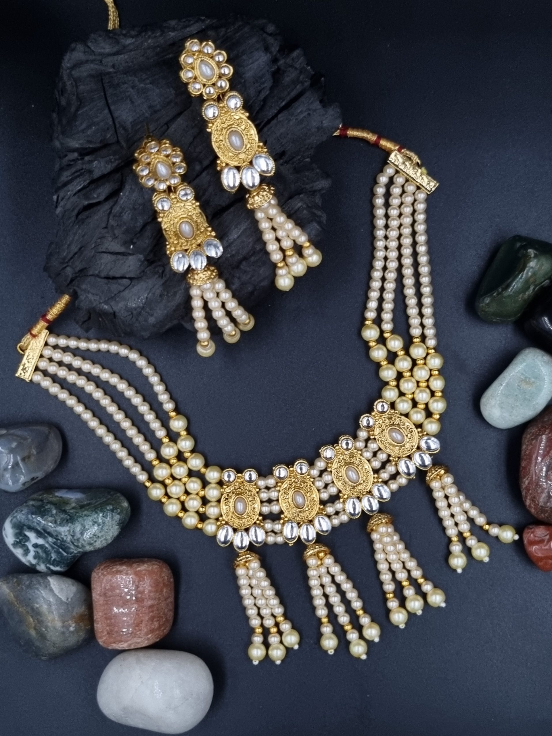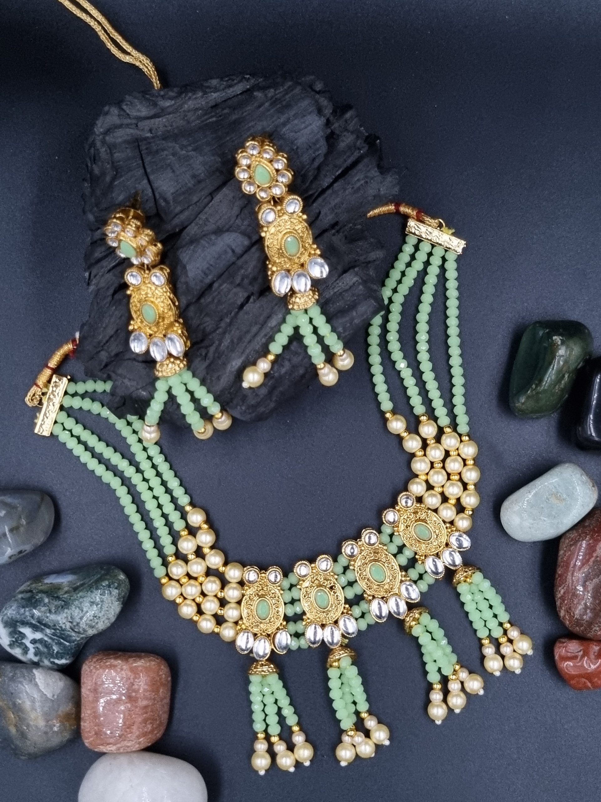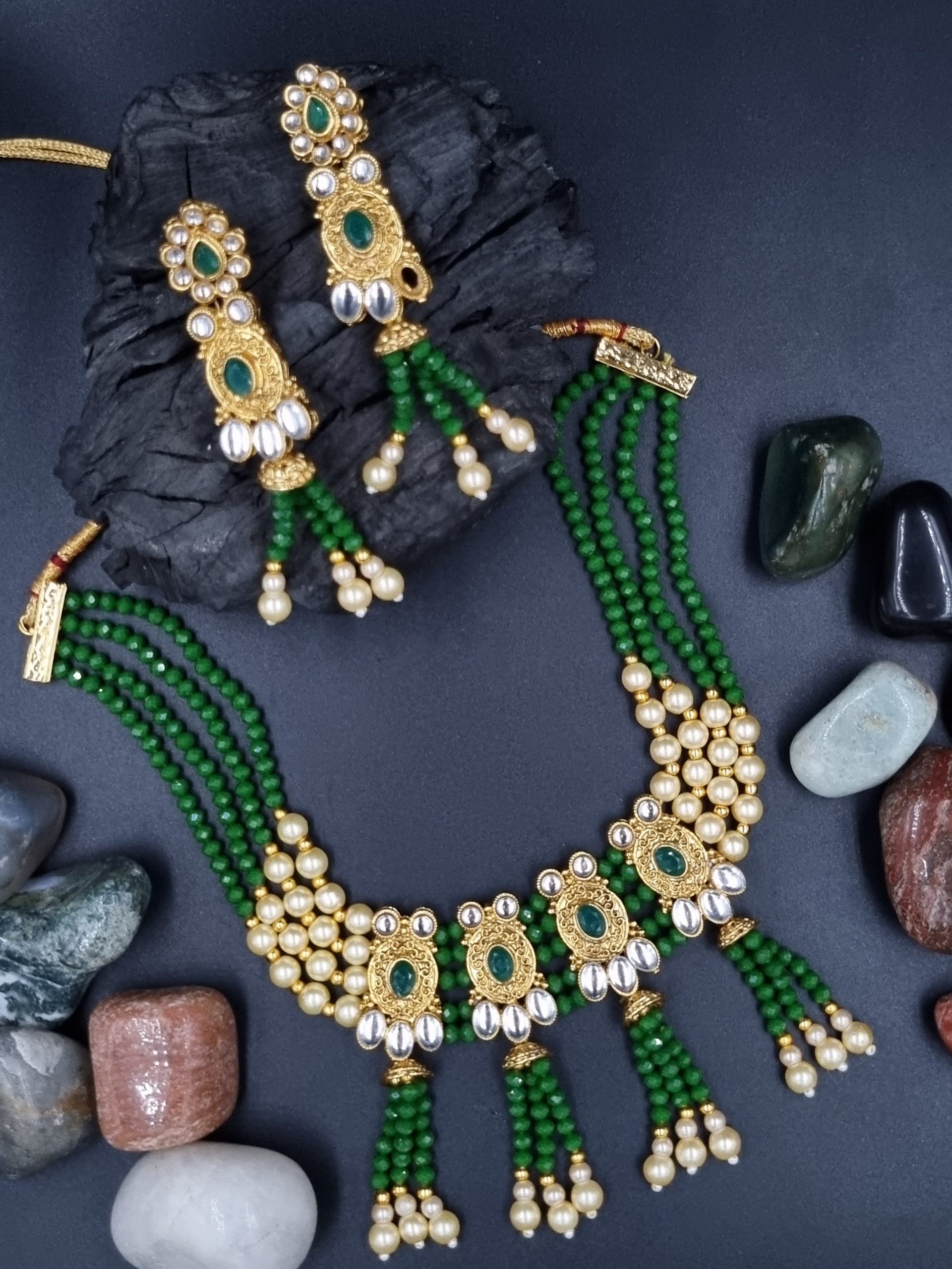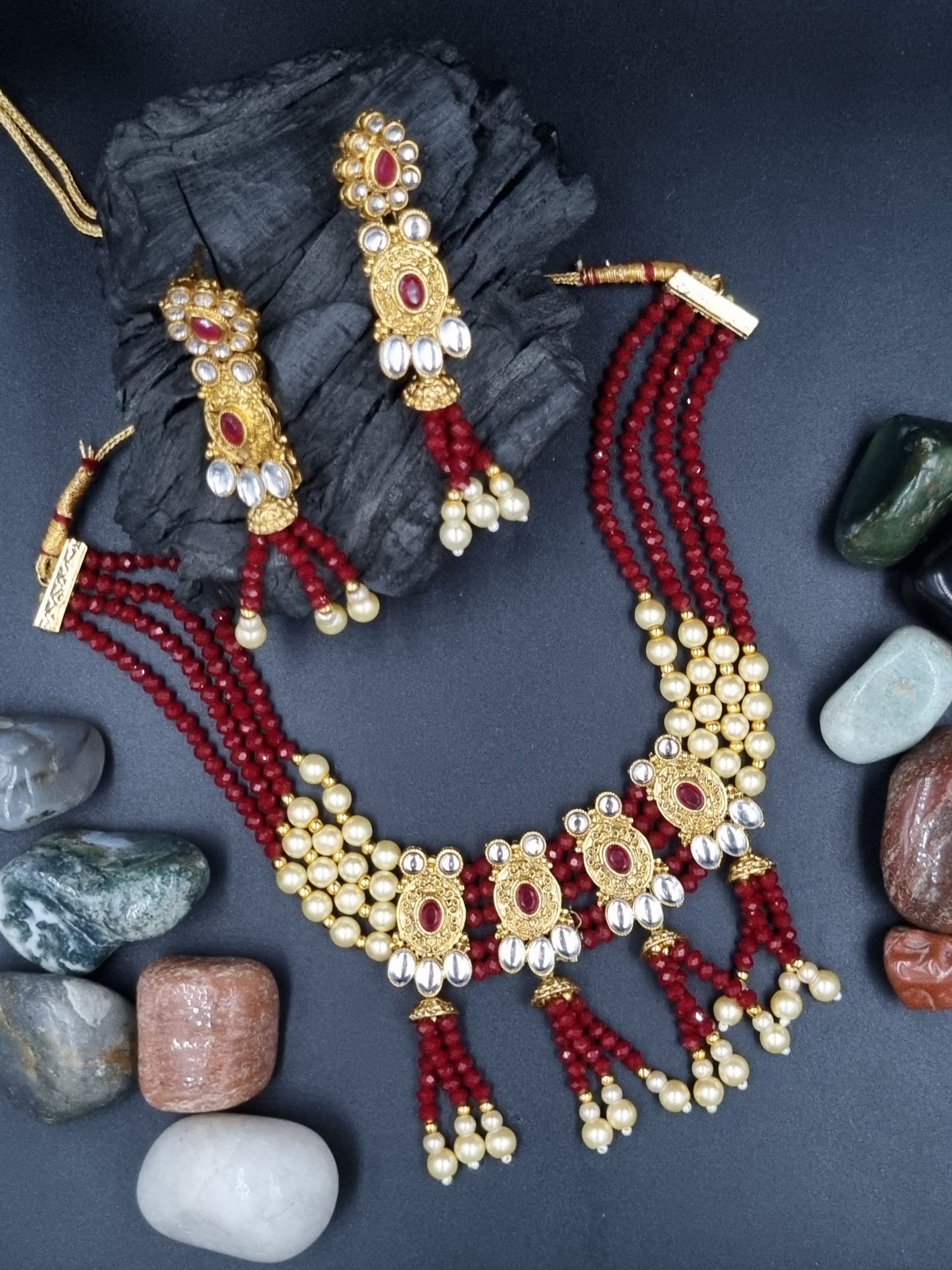 Beads / Stones : Stones / beads if used in the jewellery are either fibre based or glass based. These are all artificial stones, they are not precious or semi precious.