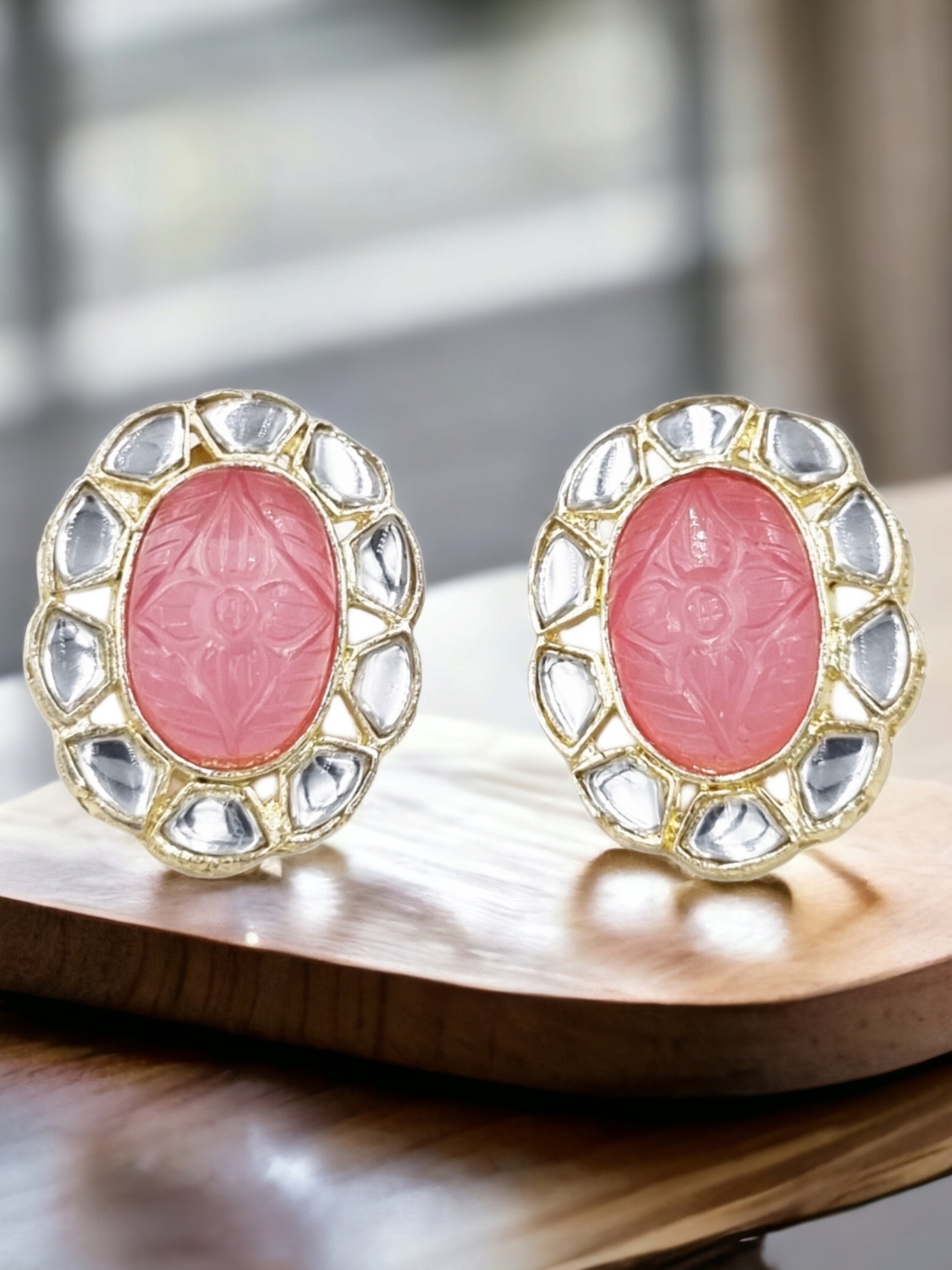 La Trendz Carving Pink Stone Gold Polish Stud Earrings For Women